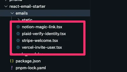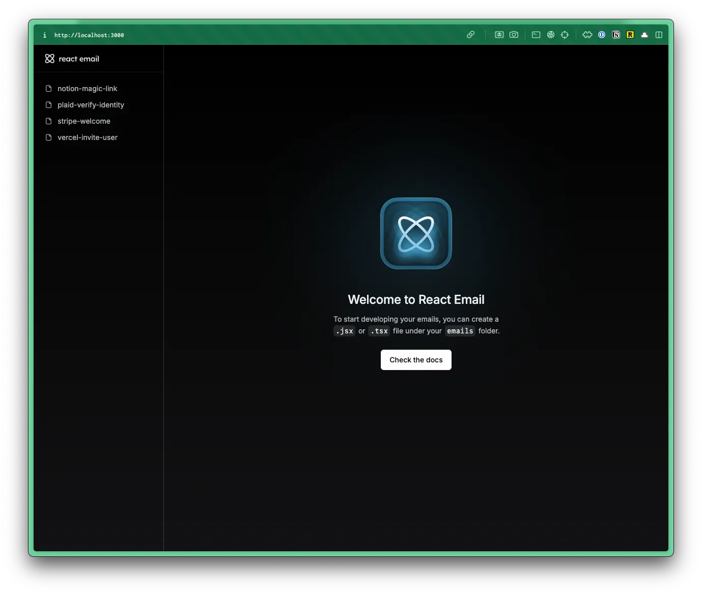 In the left sidebar, you’ll notice that React Email has 4 email examples you can preview. These correspond with the .tsx
